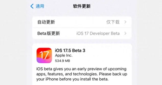 4月24日凌晨時段,Apple 終于發布 iOS 17.5 beta 3 內測系統,離上一個版本相隔一周,更新包大小為534.9MB,總大小為:7.39GB,本次更新有新變化,如你已升級內測,建議更新。