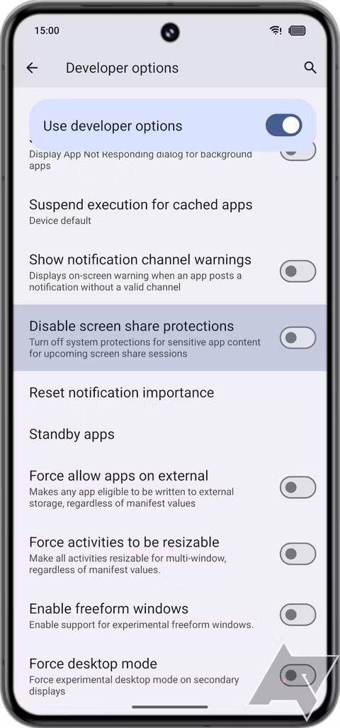谷歌在近日發布的安卓 15 Beta 1.1 更新的開發者選項中,引入了“disable screen share protections”(禁用屏幕共享保護)選項,可以在屏幕共享期間禁止運行某些系統應用以及相關通知。IT之家附上截圖如下: