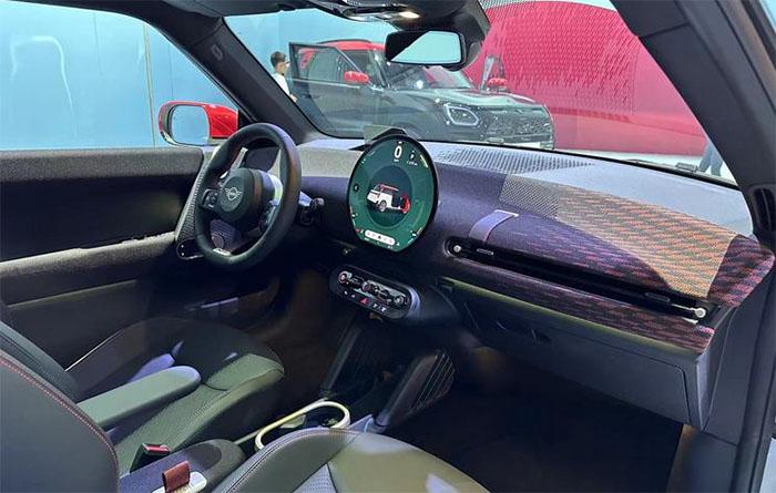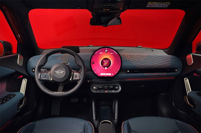 新車車里采用了簡約風格設計,并繼續搭配了大量圓形設計,其中中央多媒體屏幕圓形窄邊框OLED,并且在海外版車型上全新電動MINI COOPER取消了儀表盤之,采用HUD顯示進行讀取行車信息。