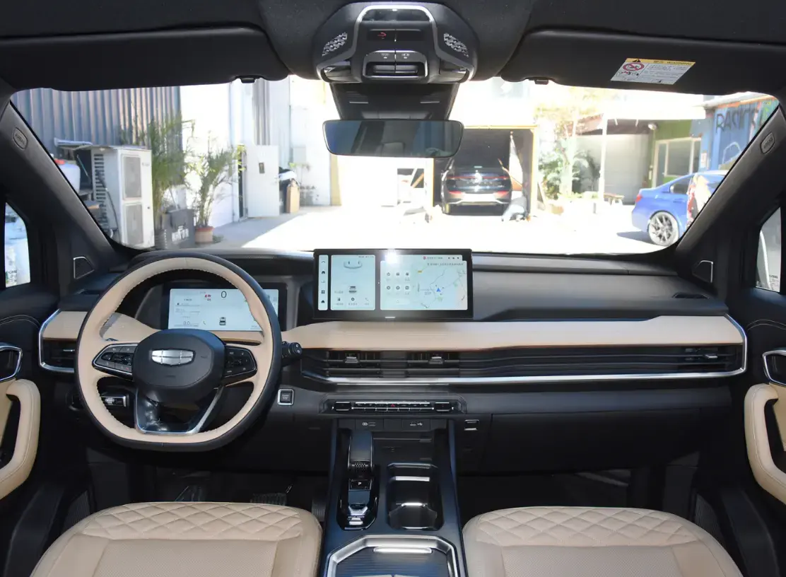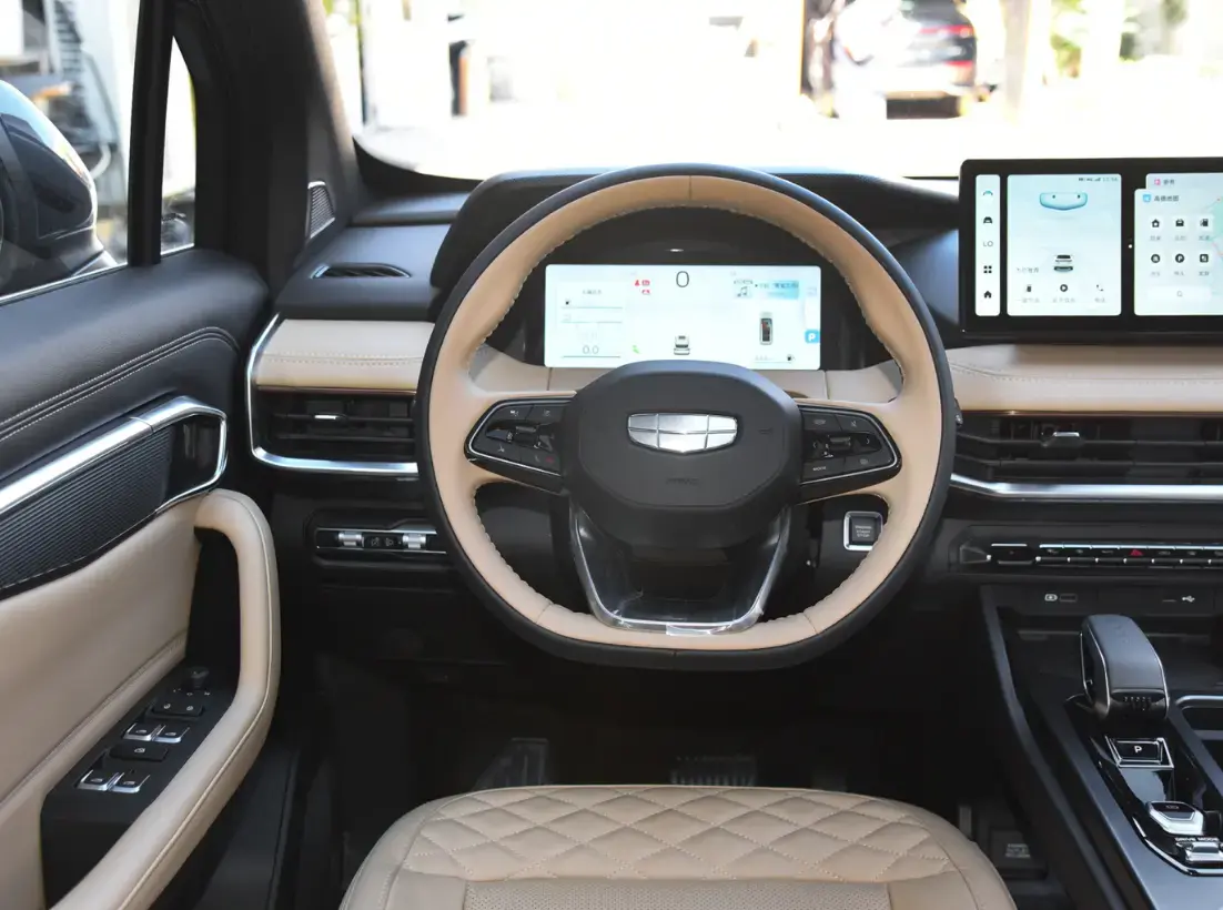 吉利豪越L的內飾同樣極具有家族風格,貫穿式的出風口將整個中控臺分成上下兩個部分。空調出風口上方還有橙色的裝飾條作為點綴,空調控制區域使用了實體按鍵方便司機盲操。