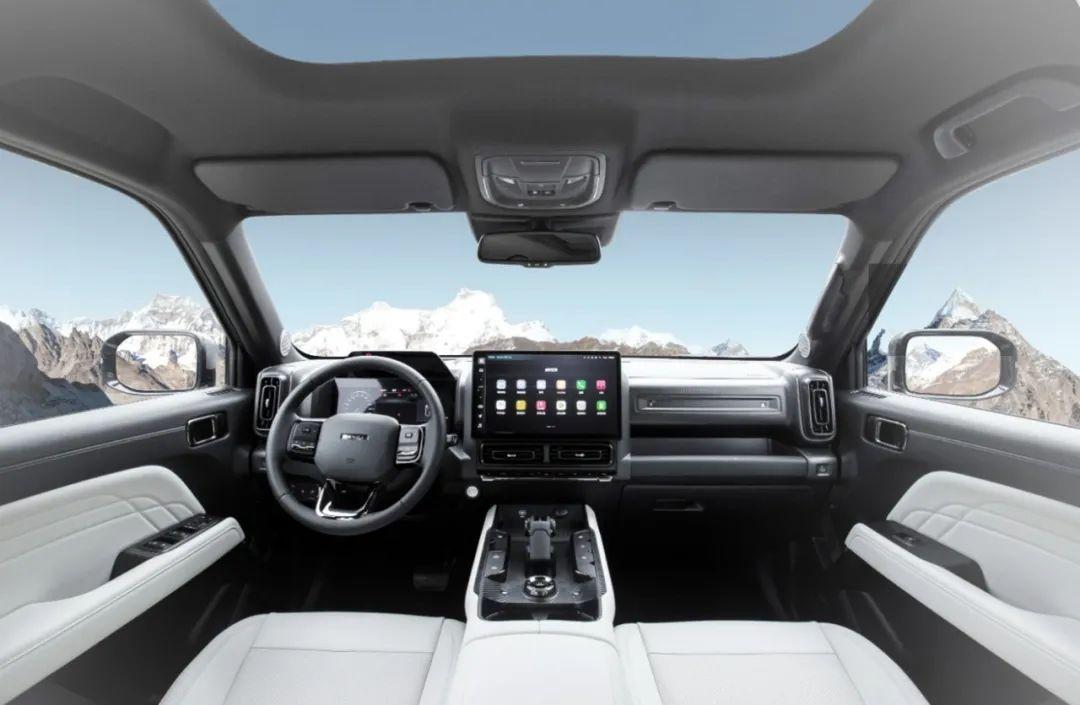 輪胎尺寸升級(jí)為255/60 R19,并提供了尺寸為265/60 R18 的AT胎作為選裝。同時(shí),整車最小離地間隙由200mm提升至221mm,涉水深度由560mm提升至580mm,通過性得到進(jìn)一步提升。