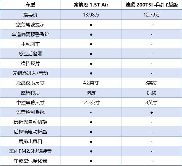 接下來,咱們就從兩款車的入門版進(jìn)行一番對比。從表格中可以看出,第十一代索納塔入門的配置就不低,尤其是舒適性配置和智能科技配置全面領(lǐng)先,而且,速騰入門版給出的是手動擋版本,而第十一代索納塔全系標(biāo)配8AT變速箱,相近的價格配置差異非常大。而中高配版本之間的配置差異和體驗(yàn)感差異則更大。