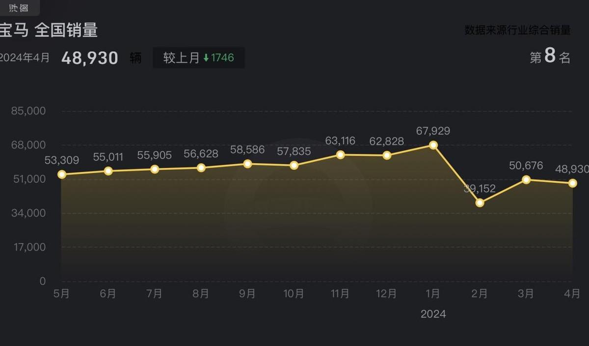 據行業綜合銷量數據統計,寶馬品牌近1年(2023.5-2024.4)中,單月銷量高峰是在2024年1月,品牌月銷量達67,929輛。此后進入2月行情峰谷,到3月、4月寶馬品牌月銷量分別為:50,676輛和48930輛。