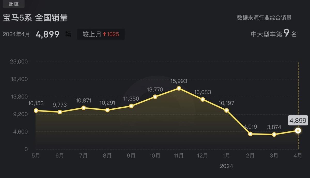 其中,寶馬5系近1年(2023.5-2024.4)中,單月銷量高峰是在2023年11月,寶馬5系月銷量達15,993輛。此后逐月下滑,其中全新寶馬5系自今年2月上市以來,已統計2、3、4月份的銷量,分別為4,019輛、3,874輛、4,899輛,全新寶馬5系上市3個月份銷量,累計不及去年11月成績。