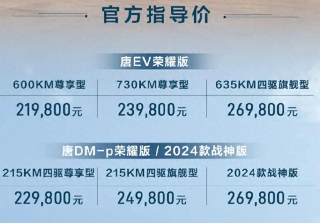 動力方面,唐EV榮耀版兩驅車型提供最大功率168千瓦、180千瓦可選,峰值扭矩均為350牛·米;四驅車型綜合功率380千瓦,峰值扭矩700牛·米。此外,全系車型CLTC工況續航都超過600公里。插混車型方面,唐DM-p榮耀版搭載由1.5T發動機與前后雙電機組成的插電混動系統,1.5T發動機最大功率102千瓦,峰值扭矩231牛·米;前后雙電機綜合功率360千瓦,綜合扭矩675牛·米。值得一提的是,全系車型都將標配云輦-C智能阻尼車身控制系統,整體的車身穩定性、操控性更加優秀。
