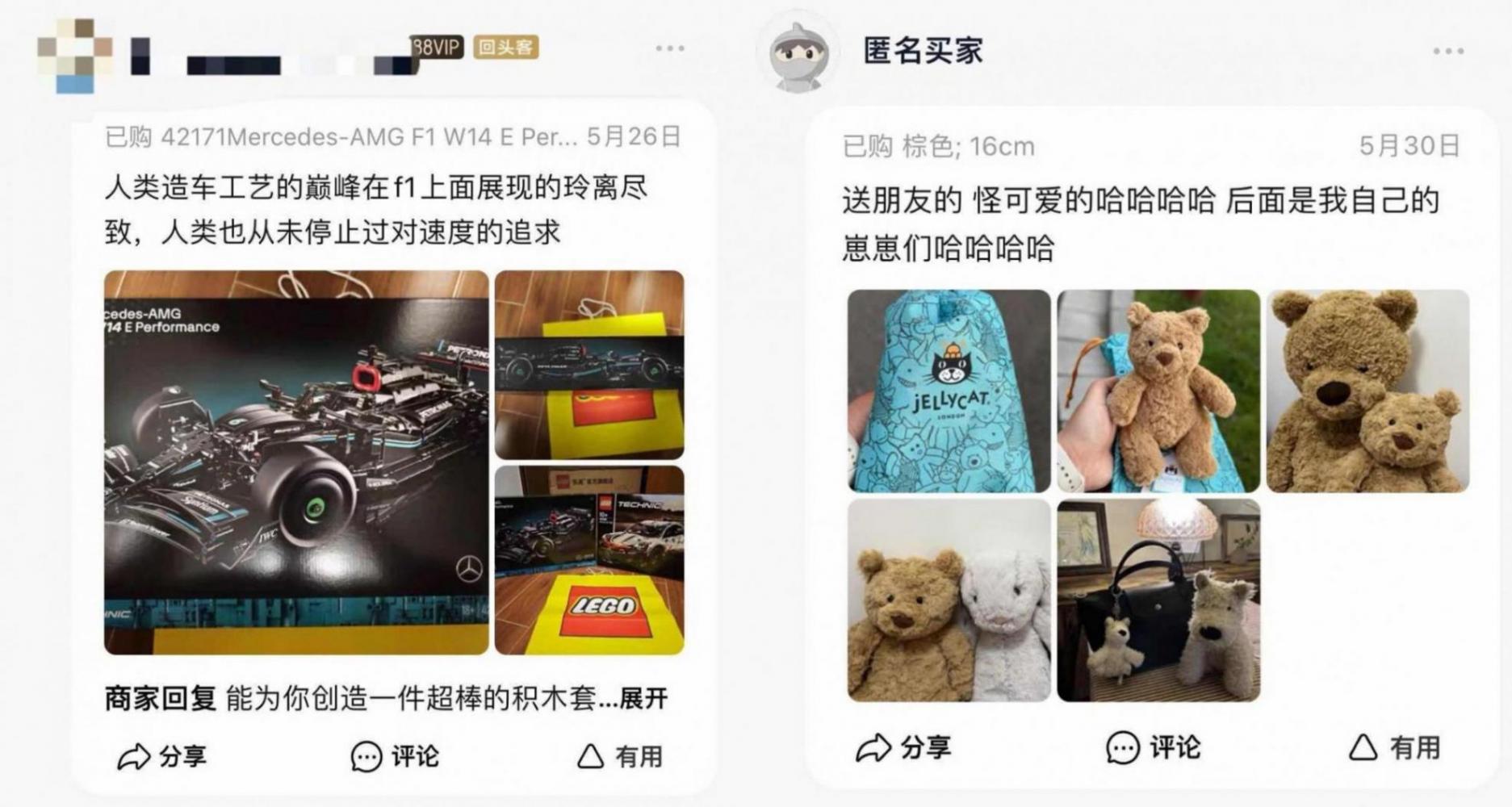 “毛絨玩具” 、“積木”是六一前熱度最高的兩個品類,其中“Jellycat”和“樂高”兩個品牌的搜索量環比上月雙位數增長,評論區里的購買者中多為給自己買禮物的成年人。兒童節已不是小孩的專屬。