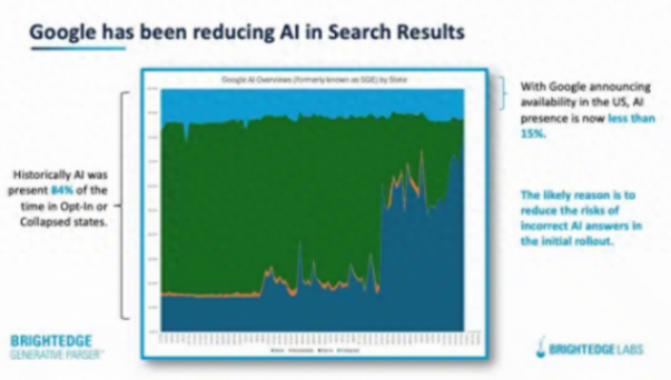 站長之家(ChinaZ.com)6月6日 消息:根據(jù)一項(xiàng)新分析,谷歌的人工智能概述現(xiàn)在只出現(xiàn)在不到15% 的查詢結(jié)果中。過去,谷歌的 AI 概覽(以前在實(shí)驗(yàn)室中被稱為搜索生成體驗(yàn))一度出現(xiàn)在84% 的查詢中。