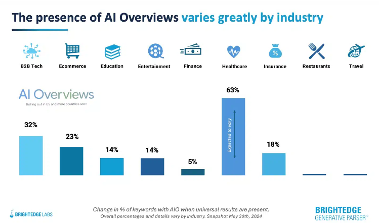 根據(jù)行業(yè)劃分,AI 概覽在醫(yī)療保健領(lǐng)域(63%)中繼續(xù)最常出現(xiàn),但低于1月份的76%。AI 概覽在餐廳(低于1月份的36%)和旅游(低于1月份的30%)中的出現(xiàn)率不到1%。
