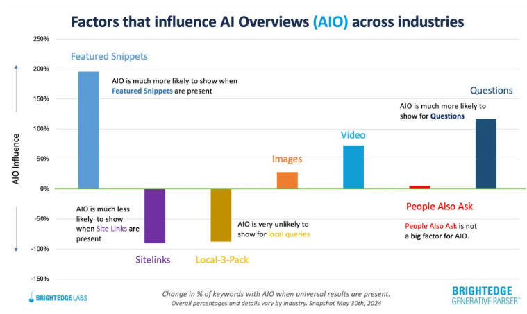 企業(yè) SEO 平臺(tái) BrightEdge 及其 BrightEdge 生成解析器與 Search Engine Land 共享了這些數(shù)據(jù)。AI 概覽和其他 Google 搜索功能。當(dāng)查詢包含精選摘要時(shí),AI 概覽出現(xiàn)的可能性會(huì)高出195%?;趩栴}的查詢也更有可能顯示 AI 概覽。