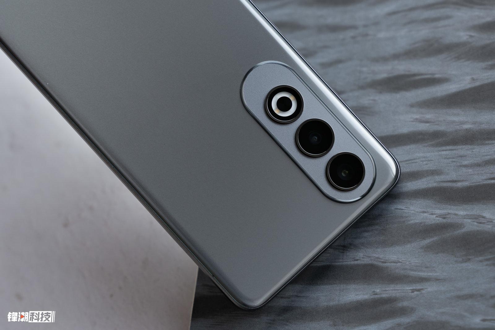 鏡頭模組的部分,OPPO K12 也采用了豎排三開孔+雙攝+環狀閃光燈的設計,附帶一個跑道型的“露水”裝飾面,設計相當簡約。它在鏡頭周圍還做了不銹鋼的鏡頭保護圈,可以保護鏡片,減少被刮花的風險。