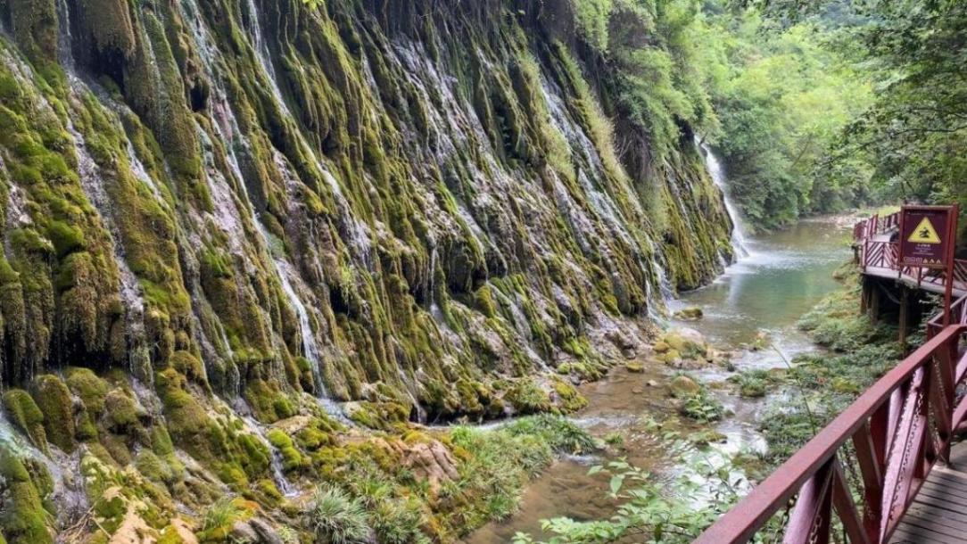 中壩大峽谷是綠綠蔥蔥的森林植被與清澈溪流,山間的空氣清新透徹,無(wú)愧于網(wǎng)友給過(guò)它陜南小江南之稱(chēng)。和大自然的短暫相處便足以令我忘卻城市嘈雜的人群與繁瑣的工作計(jì)劃。在峽谷的半山腰的位置上,我們往東南望去便能看到石泉中壩大峽谷的瀑布,百米長(zhǎng)的水簾,從谷南端的澗口跌落,珠光閃閃,宛如無(wú)數(shù)珍珠與銀絲所織成的線(xiàn)條。