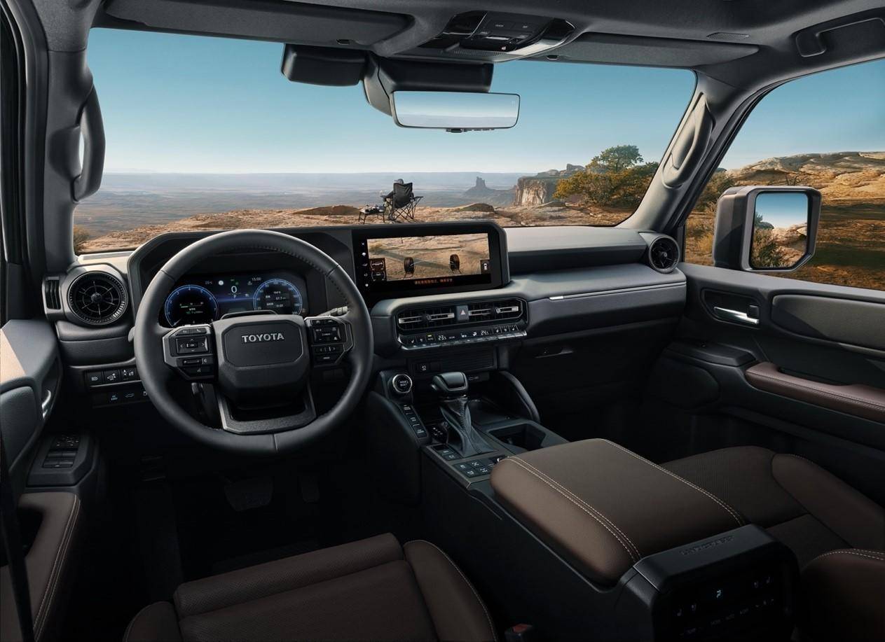 論硬派越野的智慧,全新普拉多可謂由表及里都在圍繞“更強大、更從容的駕馭”不斷進化。全新普拉多的每一處設計,皆從實際越野需求出發。2850mm的軸距精準兼顧了惡劣路面通過性與室內空間,擴大了2排、3排前后間距和行李箱空間。此外,全新普拉多的前懸設計更短,外后視鏡寬幅也低于LC150車型,確保了使用便利性與狹窄路段的通過便利性。通過前后懸短、水平車軸、座艙整體后移,縱向直立的車窗設計,打造出獨特的車身比例。車輛燈組及格柵的機能部件放置于中央偏高處,保證通過惡劣路況時也不易損壞。緊致的車身配合外凸式的輪胎設計,營造壓倒性的穩定感。在內飾設計上,車內儀表臺采取水平基調設計,通過追求前方和側方視野的極致設計,確保安全的越野行駛。