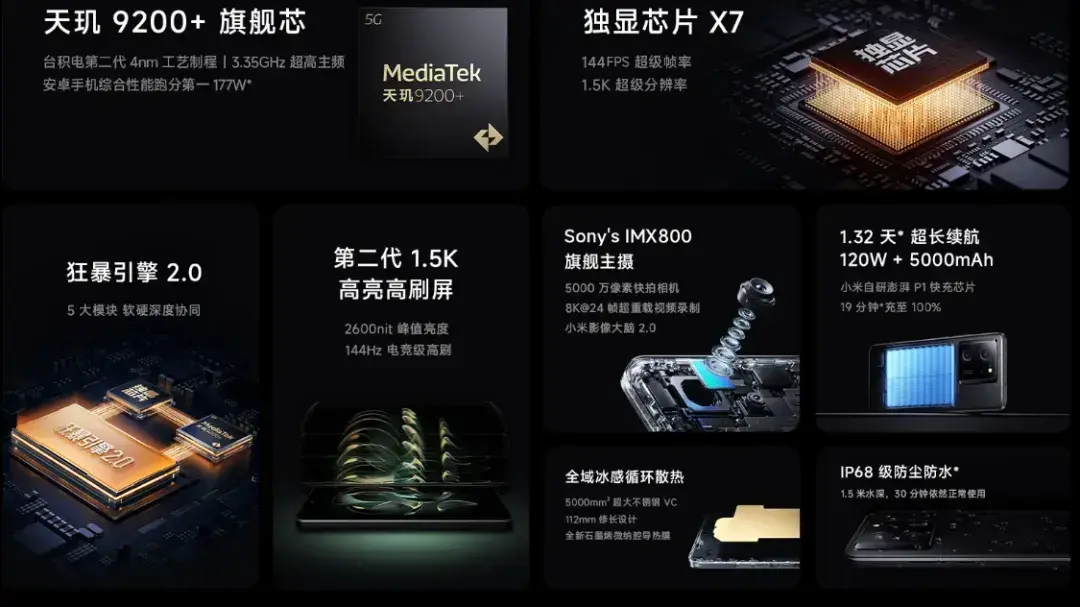 紅米K60至尊版采用了天璣9200+處理器,還帶了個獨顯芯片X7,天璣9200+和驍龍8 Gen2屬于同檔次的產品,面對驍龍8s Gen3和驍龍7+ Gen3自然沒有什么壓力,獨顯芯片X7則帶來了超分和超幀的效果,就算iQOO Z9 Turbo也有獨顯芯片,但它的獨顯芯片只支持超幀。
