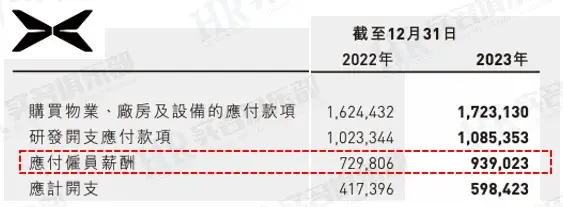 2023年底,小鵬“應付雇員薪酬”9.39億,年底員工1.3萬人,即人均年終獎6.9萬(含12月工資),2022年是4.6萬。