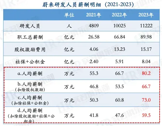 以2023年蔚來研發薪酬為例,主要有四種統計口徑: