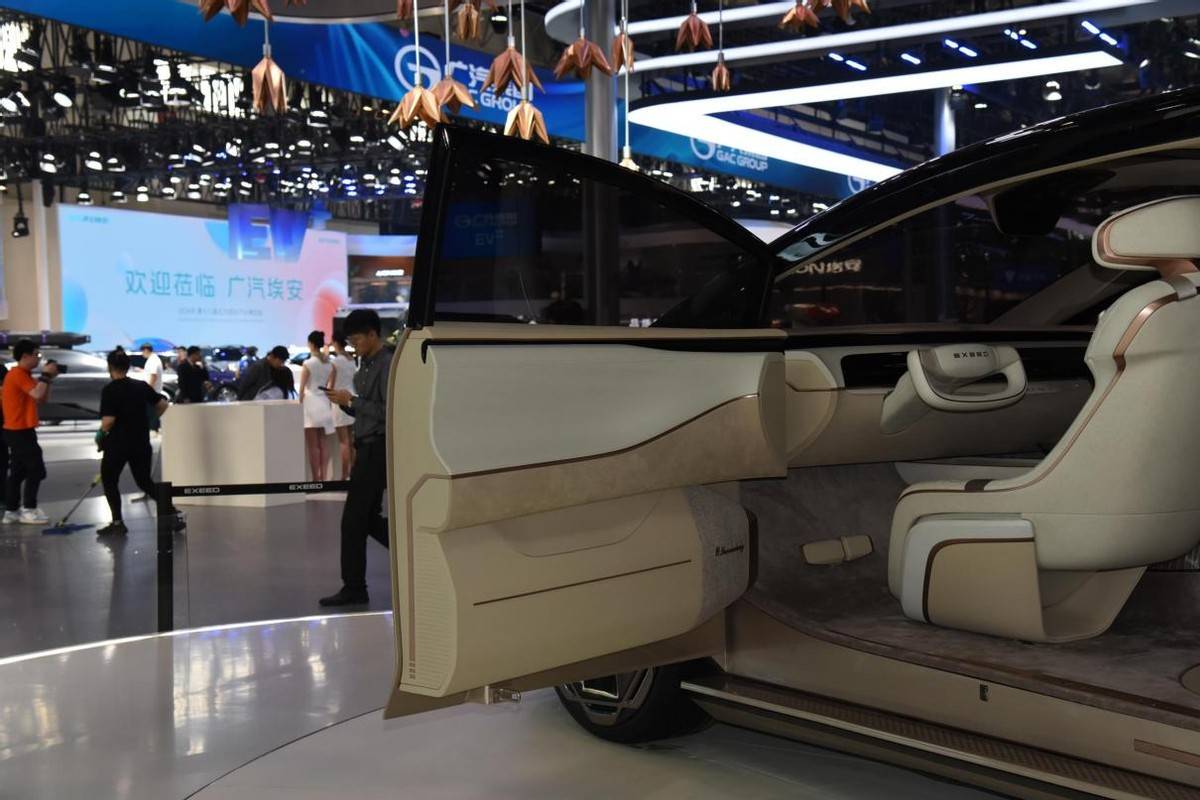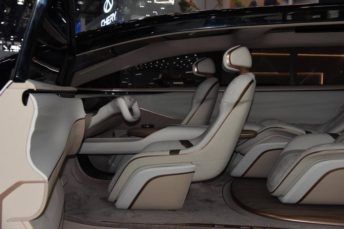 從側身來看,車輛整個車身都是按照One Box的一體化概念打造的,懸浮式車頂全部采用黑色材料打造,烤漆支柱很好地隱藏了起來,A柱三角區布局了小尺寸后視鏡、車身上并沒有出現實際的車門把手,而輪轂則采用了超低風阻的全封閉設計,配合側裙邊緣出現的一條由車尾延長而來的黑色裝飾帶,修長、科技、低風阻是這臺車身上最顯著的元素風格。