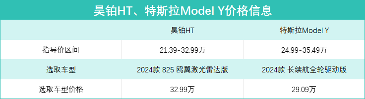 先來看看兩臺車的價格,昊鉑HT全系指導價區間為21.39-32.99萬,該車定位為中大型豪華純電SUV;特斯拉Model Y全系指導價區間為24.99-35.49萬,該車定位為中型SUV。其實能看出昊鉑HT和特斯拉Model Y的產品定位存在差異,前者主打豪華,后者主打科技,但兩臺車的價格存在明顯交集,自然也存在競爭關系。