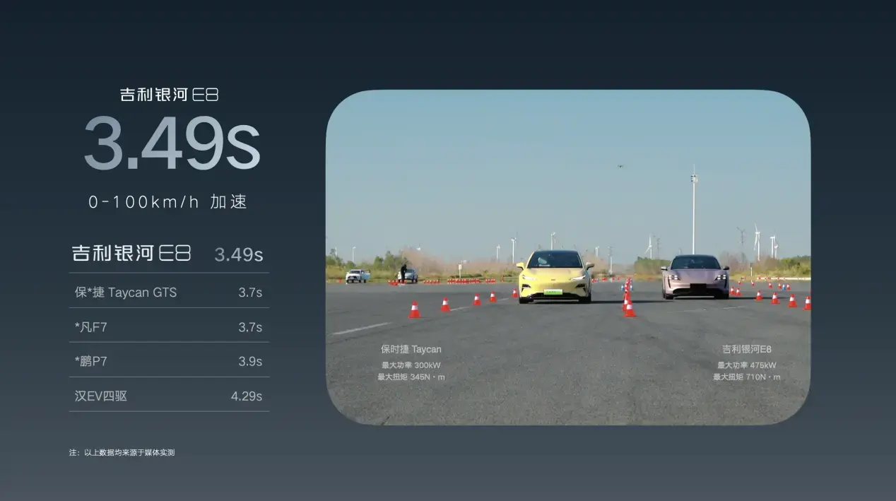 其次則是動力,銀河E8提供后驅(qū)版和四驅(qū)版可選,其中后驅(qū)版車型采用400V架構(gòu),使用單電機,電機最大功率為200kW,最大扭矩343牛·米,在它的加持下,后驅(qū)版的E8能做到5.95秒破百,最高車速190km/h,數(shù)據(jù)看著好像不怎么出色,但在同價位車型中已經(jīng)是頂流水平。