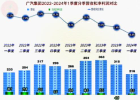 按季度看,2023年,特別是前三季度的表現(xiàn)相當(dāng)好,除了盈利能力有所下降,營(yíng)收增長(zhǎng)還較快。但是從四季度開(kāi)始,營(yíng)收增長(zhǎng)變慢,2024年一季度開(kāi)始了近兩成左右的同比下跌,形勢(shì)就有點(diǎn)緊張了。而這個(gè)時(shí)間點(diǎn),正好與國(guó)內(nèi)市場(chǎng),價(jià)格戰(zhàn)打響的時(shí)間基本同步,看來(lái),廣汽集團(tuán)受到了這次價(jià)格戰(zhàn)的較大影響。