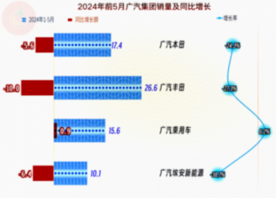 如果看2024年前五個(gè)月的銷(xiāo)量對(duì)比,除了乘用車(chē)還略有增長(zhǎng)之外,其兩大合資品牌和埃安新能源汽車(chē)的銷(xiāo)量都是兩成以上的下跌,這樣的經(jīng)營(yíng)形勢(shì)當(dāng)然比較嚴(yán)峻了。兩大合資品牌是利潤(rùn)源,新能源是未來(lái)的希望,“當(dāng)下”和“未來(lái)”都受到重創(chuàng),是誰(shuí)都會(huì)著急。