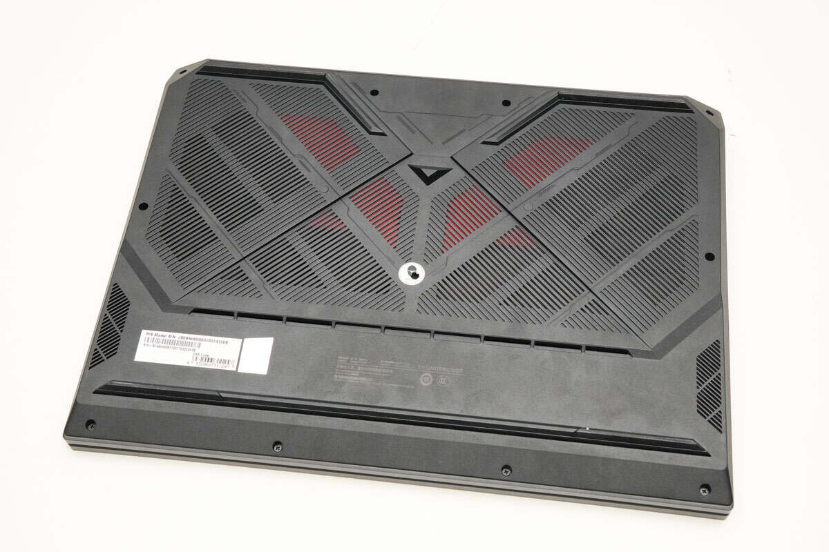 游戲本D面為大面積的大面積的散熱格柵,上方為設計感十足的條形硅膠腳墊,起到固定和增加增大進風量的作用。