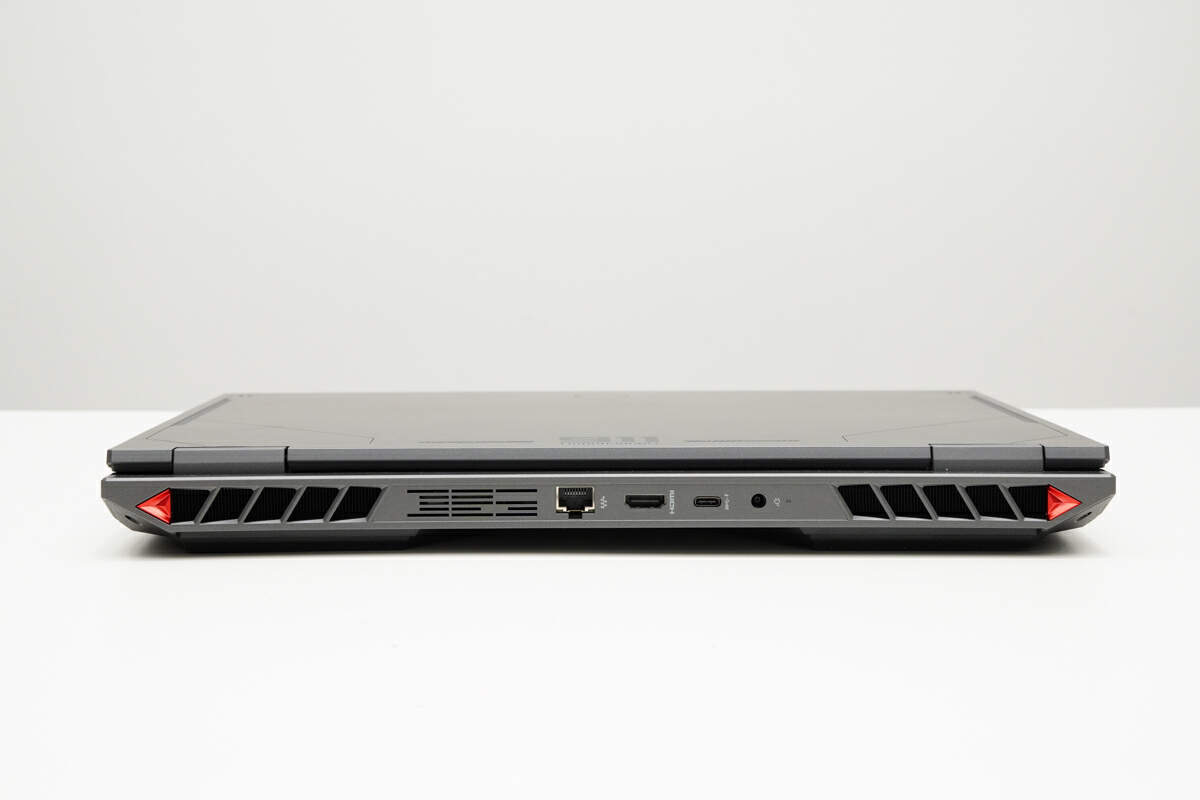 雷神獵刃 16游戲本轉軸處左右兩側為散熱出風口,中間部分從左到右依次為RJ45 千兆網口、HDMl2.1接口、AC 電源、USB3.1 Gen2 Type-C 接口(10Gbps、DP1.4 / 獨顯、140W PD 充電)和AC電源接口 。