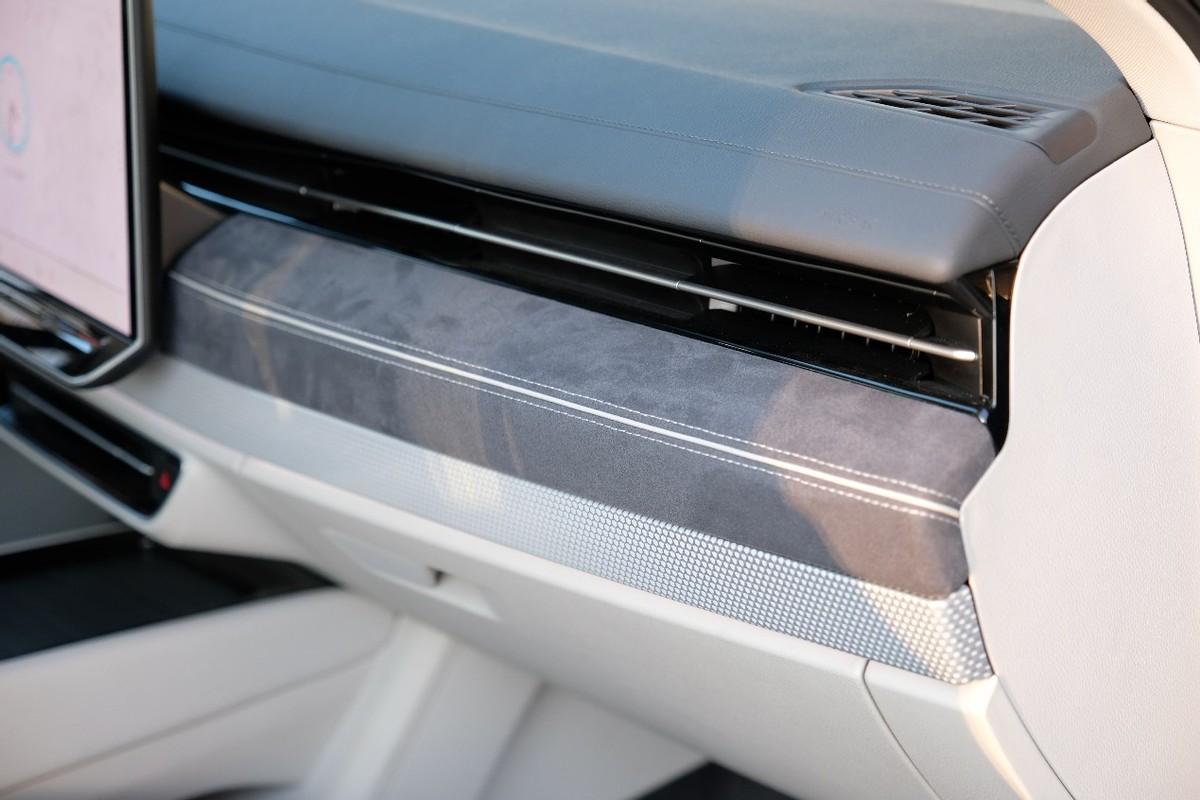 第一眼見到ID.7 VIZZION的內飾,它會營造出一種極其簡約、干凈的印象,中控區域沒有任何實體操作按鍵,全部集成在了中間那塊大屏幕上。內飾的整體做工精致、細膩,日常接觸的區域全部用上了軟質材料進行覆蓋,門板和副駕駛臺區域還用上了翻毛皮材質進行點綴,營造一絲運動氛圍。
