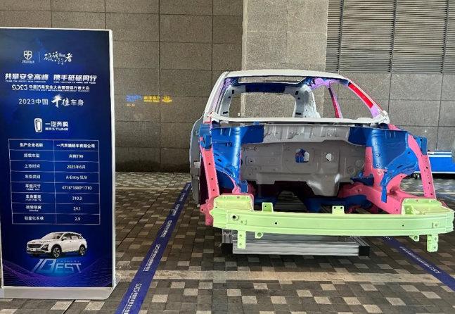 在車身結構方面,奔騰T90采用了行業領先的雙E籠式車身結構,白車身高強度鋼占比高達74%,強度為1500Mpa的熱成型鋼占比則為25%以上,車身扭轉剛性達到了24,000N·m/°,可承受5倍于車身的自重,用堅如磐石來形容它很是貼切。正因表現如此出色,奔騰T90也是成功獲得了2023中國十佳車身稱號。