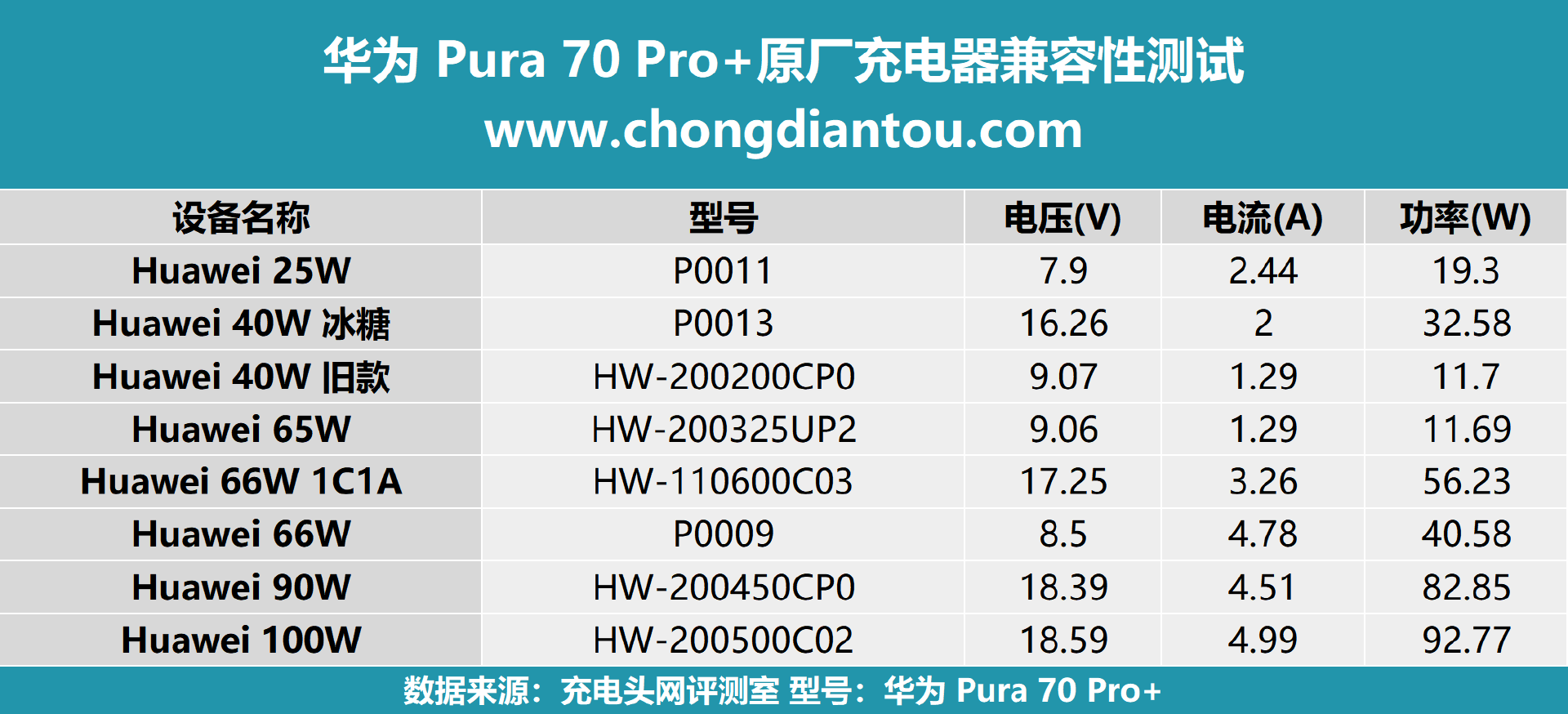 將華為系各充電器兼容性測試的數據匯總,方便大家查看。從測試結果可以看出,為手機充電時握手9V、18V電壓檔位;除舊款充電器外,原廠其他充電器的兼容性十分優異,提升用戶的快充體驗。