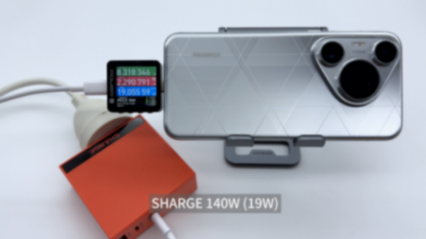 使用SHARGE 140W 充電器的USB-C接口為華為Pura 70 Pro+ 手機充電,實測其功率為8.32V 2.29A 19.06W。