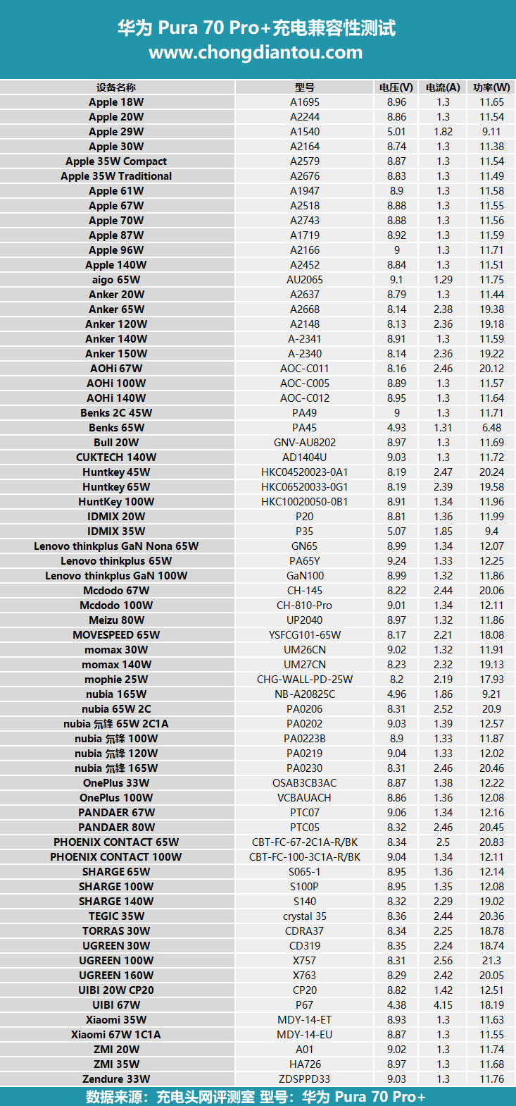 將以上測試的充電設備的數據整理為表格,可以看到,絕大多數三方充電器給華為Pura 70 Pro+充電可握手 9V 電壓檔位。