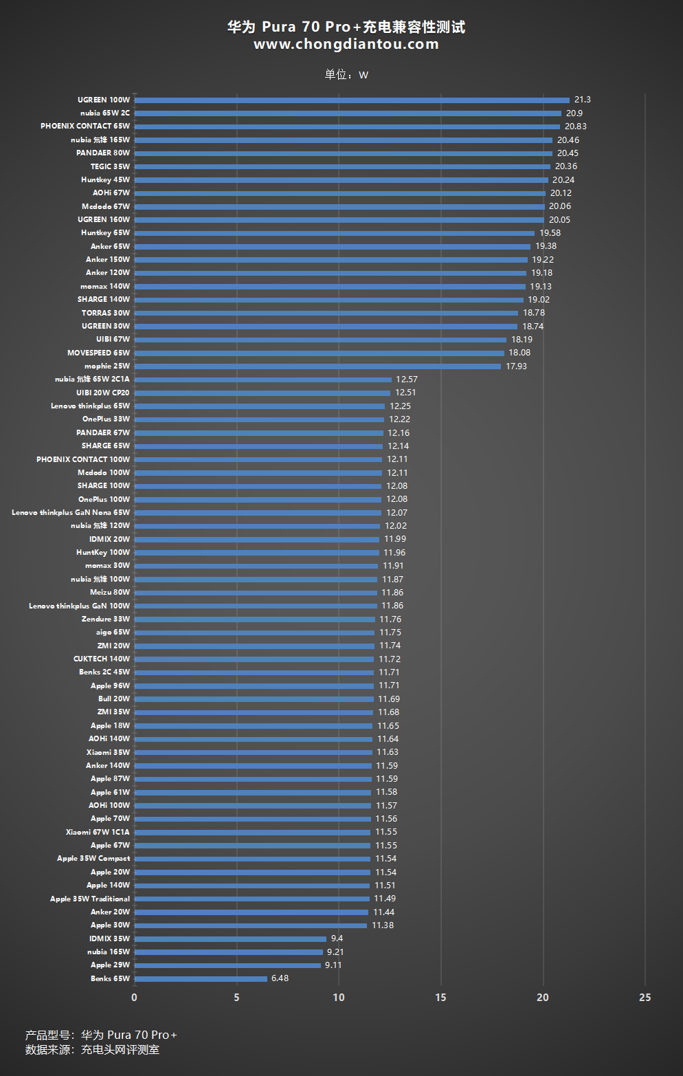 柱狀圖部分可以清楚的看出原廠充電器充電功率的大小,使用附贈的 Huawei 100W充電器,華為Pura 70 Pro+最高充電功率達92.77W左右。而舊款的 Huawei 45W、65W充電器,并不能完美的兼容,功率只有11W左右。