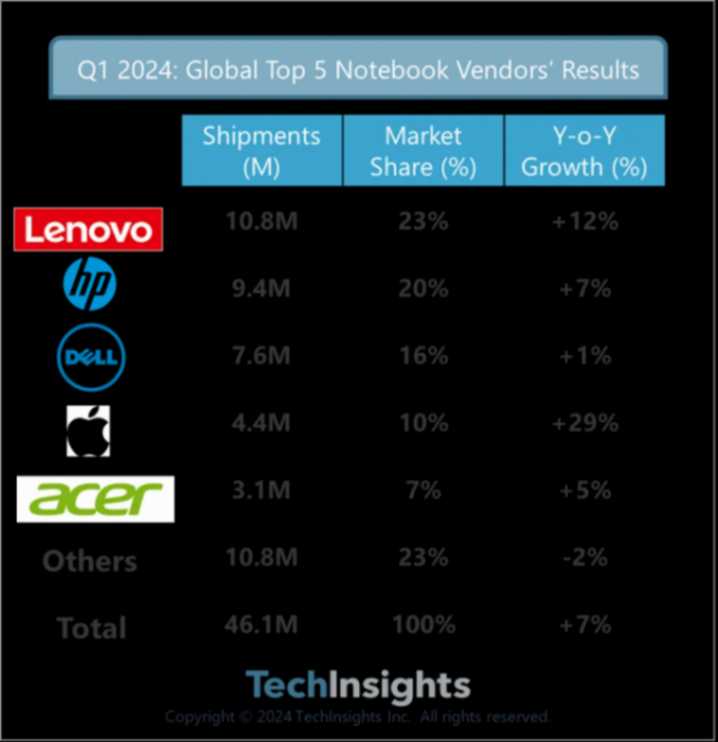 2024Q1全球筆記本電腦出貨量公布,聯想一馬當先,AI PC立大功