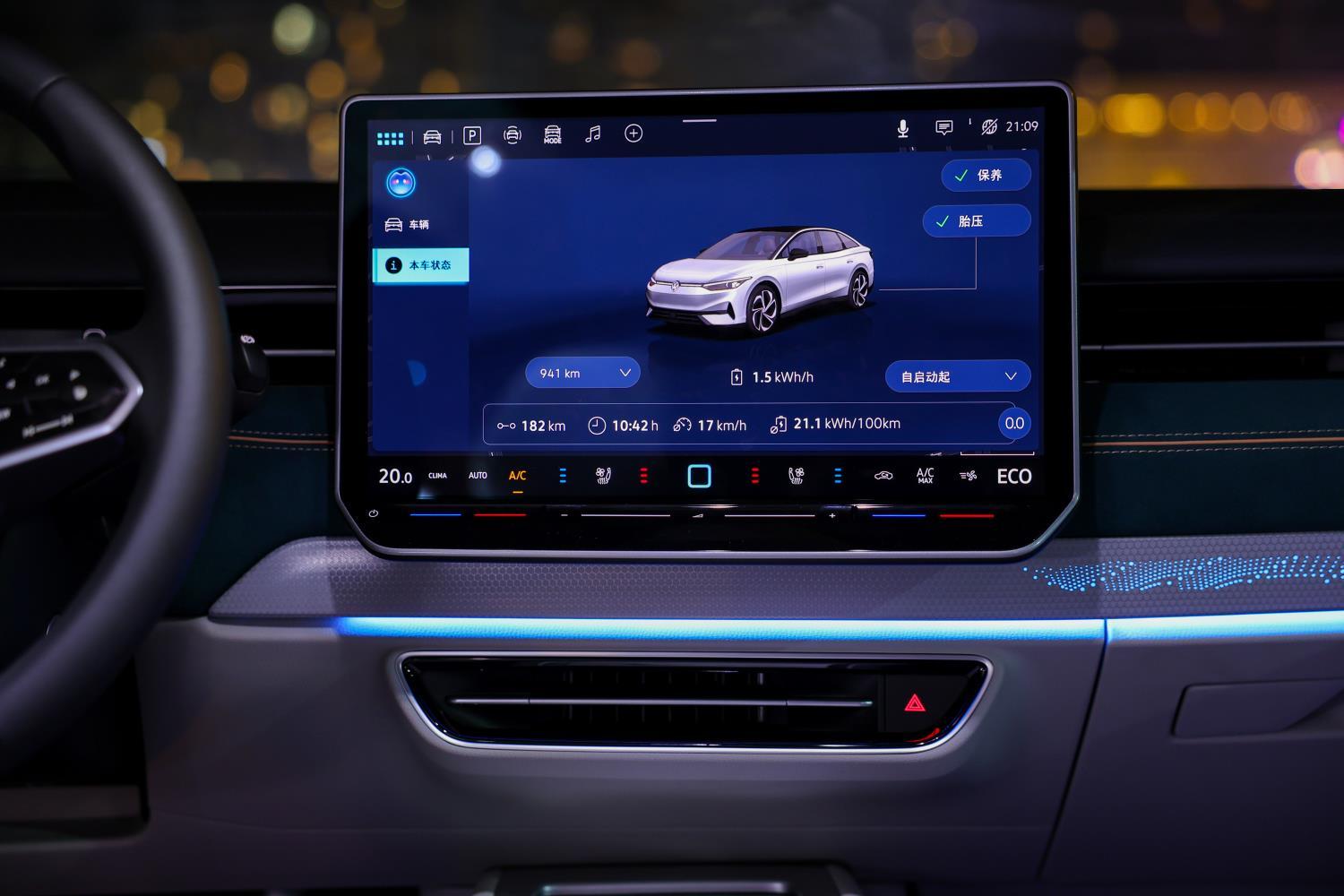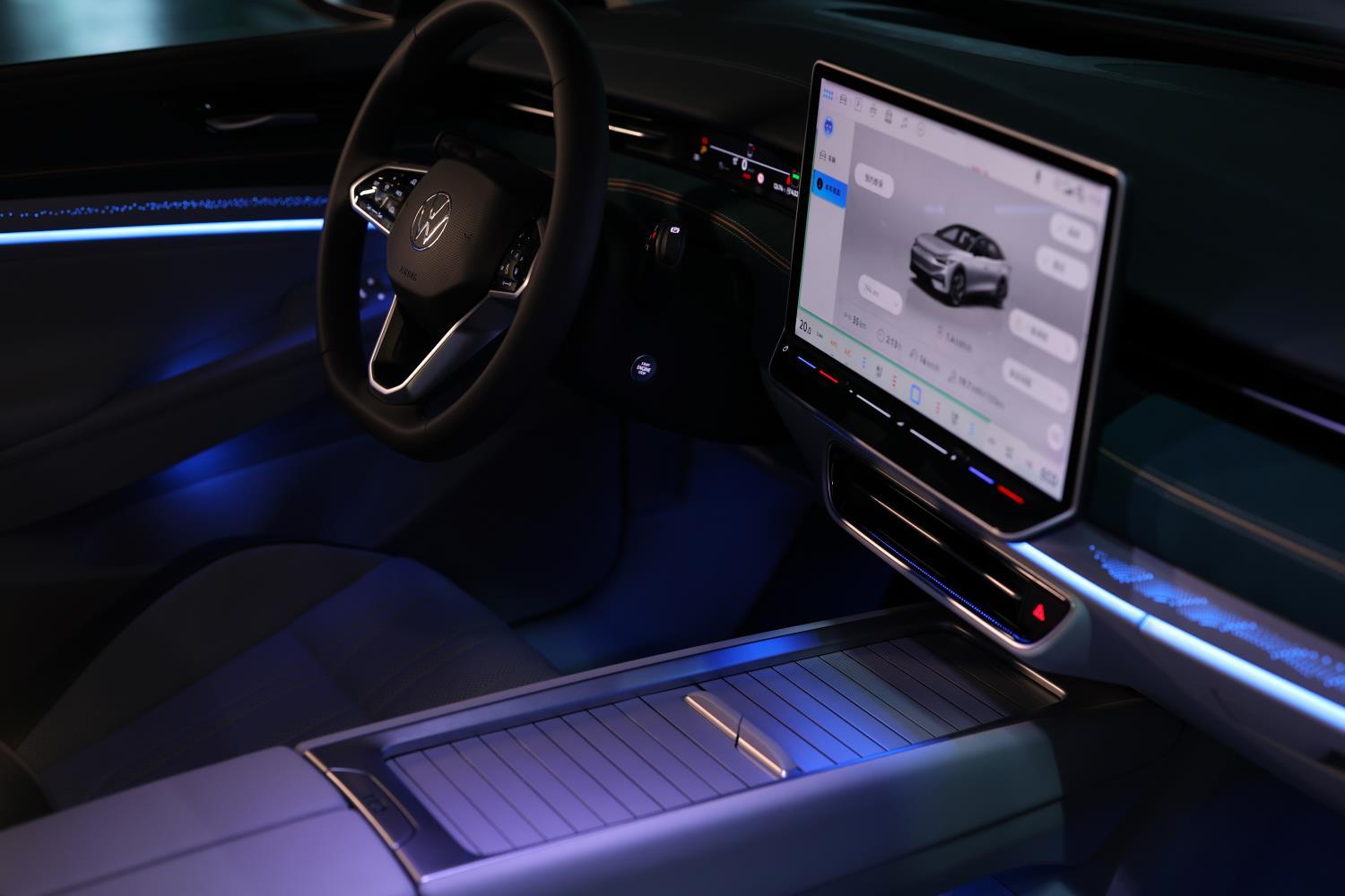 相比新勢力的冰箱彩電大沙發,ID.7 VIZZION更加注重車機交互和氛圍上的營造,除了車內本身的30色氛圍燈、14揚聲器哈曼卡頓音響系統、負離子空氣凈化器所提供的視覺、聽覺、嗅覺上的沉浸式體驗外,在前風擋下面還有一條與你實時互動的彩色燈帶,你在車內的一切活動,它都會給予你反饋,讓你仿佛與一個智能生命體共處一車。