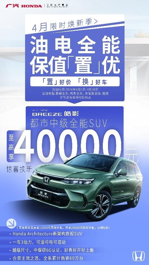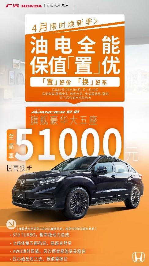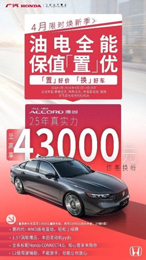 “置”好價,“換”好車,廣汽本田置換購車鉅惠政策來了!4月限時煥新季火熱開啟,截至2024年4月30日,置換購買“雅閣、皓影、奧德賽混動、冠道”四大明星車型的用戶,可享限時補貼高達5.1萬元的驚喜換新政策,直接助您輕松升級座駕,更有至高24期0息的超值金融政策,讓您0壓力購車。油電全能,保值“置”優(yōu),廣汽本田堅持高品質(zhì)造車,旗下款款皆好車,為用戶帶來長期安心用車價值。廣汽本田此次的限時補貼政策,絕對是您置換購車的絕佳時機,詳情可咨詢廣汽本田當?shù)靥丶s店。