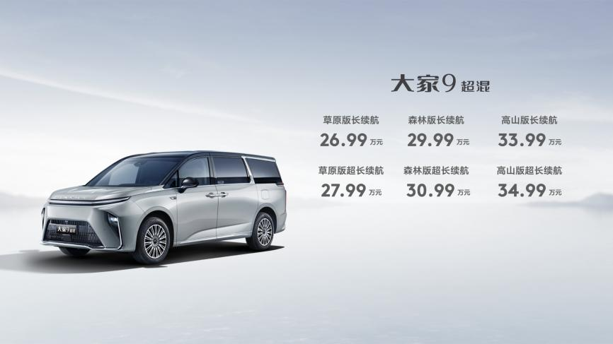 6月7日,“大家”系列“超混雙子星”大家9超混、大家7超混迎來(lái)全球上市發(fā)布,其中,大家9超混長(zhǎng)續(xù)航版售價(jià)26.99萬(wàn)元起,超長(zhǎng)續(xù)航版27.99萬(wàn)元起;大家7超混長(zhǎng)續(xù)航版售價(jià)19.99萬(wàn)元起,超長(zhǎng)續(xù)航版20.99萬(wàn)元起。
