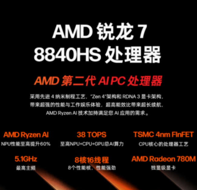 這一次發(fā)布的戰(zhàn) X 銳龍版搭載的是 AMD R7 8840HS 處理器,擁有 8 核心 16 線程,最高主頻可以達到 5.1GHz,另外還繼承了 Radeon 780M 顯卡,綜合性能表現(xiàn)出色的同時,還能將功耗控制在一個比較不錯的水平。