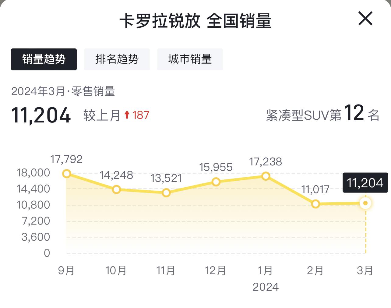 現在優惠后起售價都不到10萬了,而且起步就是2.0升的動力,全系標配7氣囊+L2級駕駛輔助系統,難怪3月份一汽豐田卡羅拉銳放又賣了11,204輛,近半年來,每個月的銷量均在萬臺以上,個別月份銷量甚至超過了1.7萬輛。其實一汽豐田卡羅拉銳放的上市時間也不長,憑啥它就能持續保持高銷量呢?