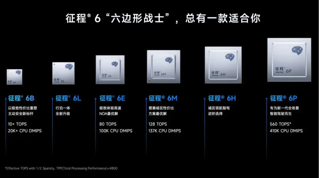 再看中階智能駕駛市場,在10萬到20萬車型的智能駕駛市場,地平線推出普惠城區性價比方案最優解——征程6M,以及極致體驗高速NOA最優解——征程6E,并提供符合AEC-Q104車規標準的SiP模組和Matrix 6域控參考設計,以超高集成度實現更低的功耗和更優的系統成本。