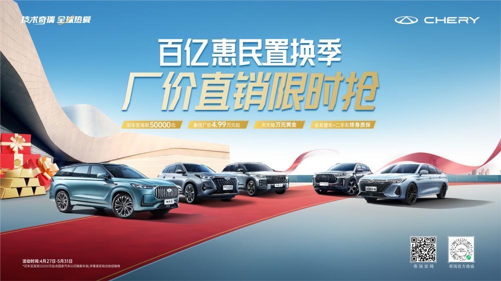 4月27日-5月31日,奇瑞品牌響應國家“以舊換新”補貼政策號召,推出“百億惠民置換季 廠價直銷限時搶”活動,舊車不限車況、不限里程、不限年限,至高可抵5萬元,更有每天抽萬元黃金以及全系整車+二手車終身質保等多重福利,助力廣大消費者購買心儀好車。