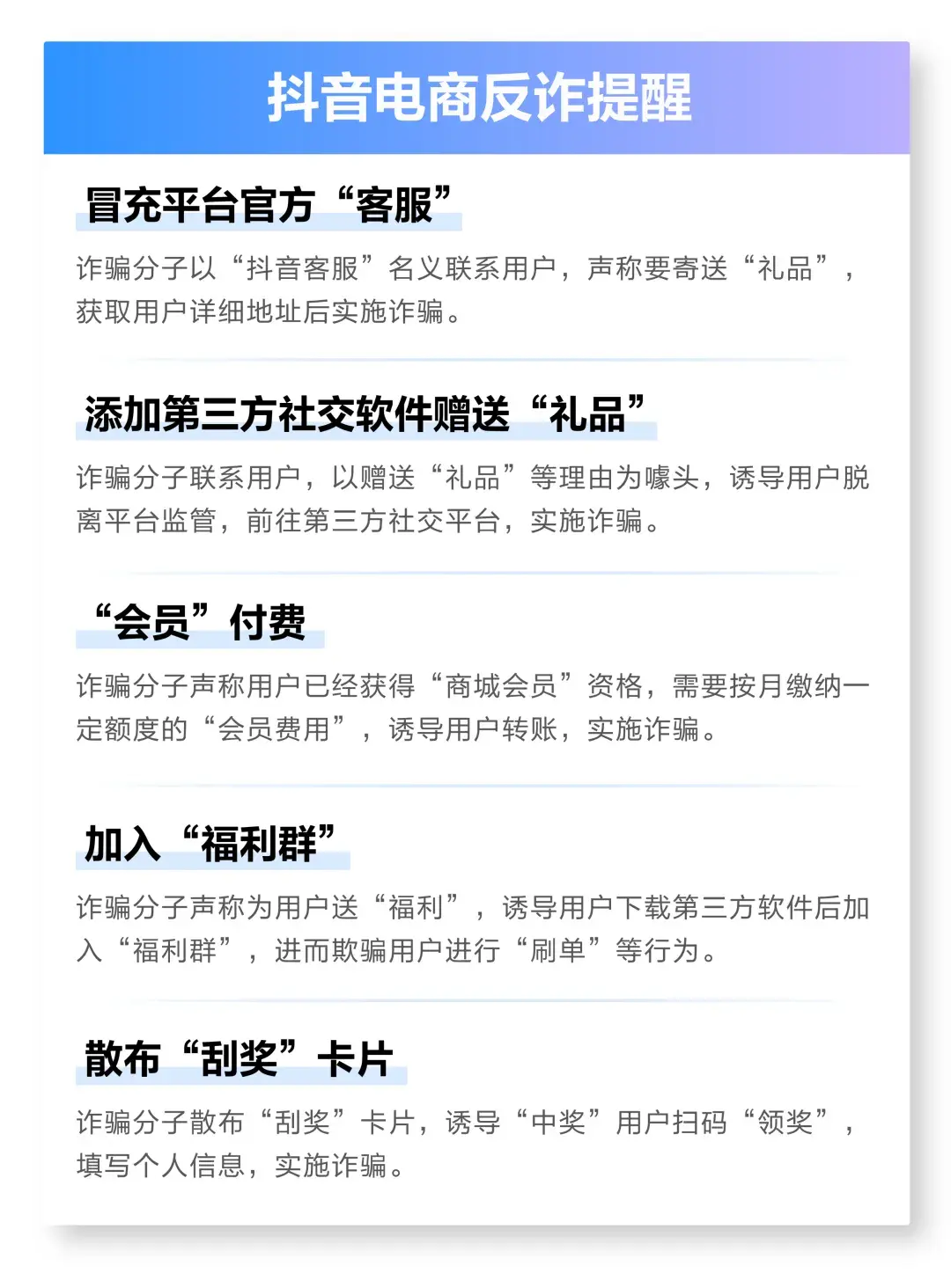 抖音電商呼吁廣大網友一起監督防范相關詐騙行為,如發現不良內容或異常行為,可以在站內舉報或發送詳情至舉報郵箱feedback@douyin.com。平臺將及時跟進處理。對于涉嫌違法犯罪的行為,我們也將積極配合有關部門進行打擊。