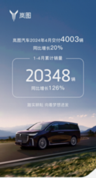 嵐圖汽車4月交付4003輛同比增長20%,1-4月20348輛同比增長20%