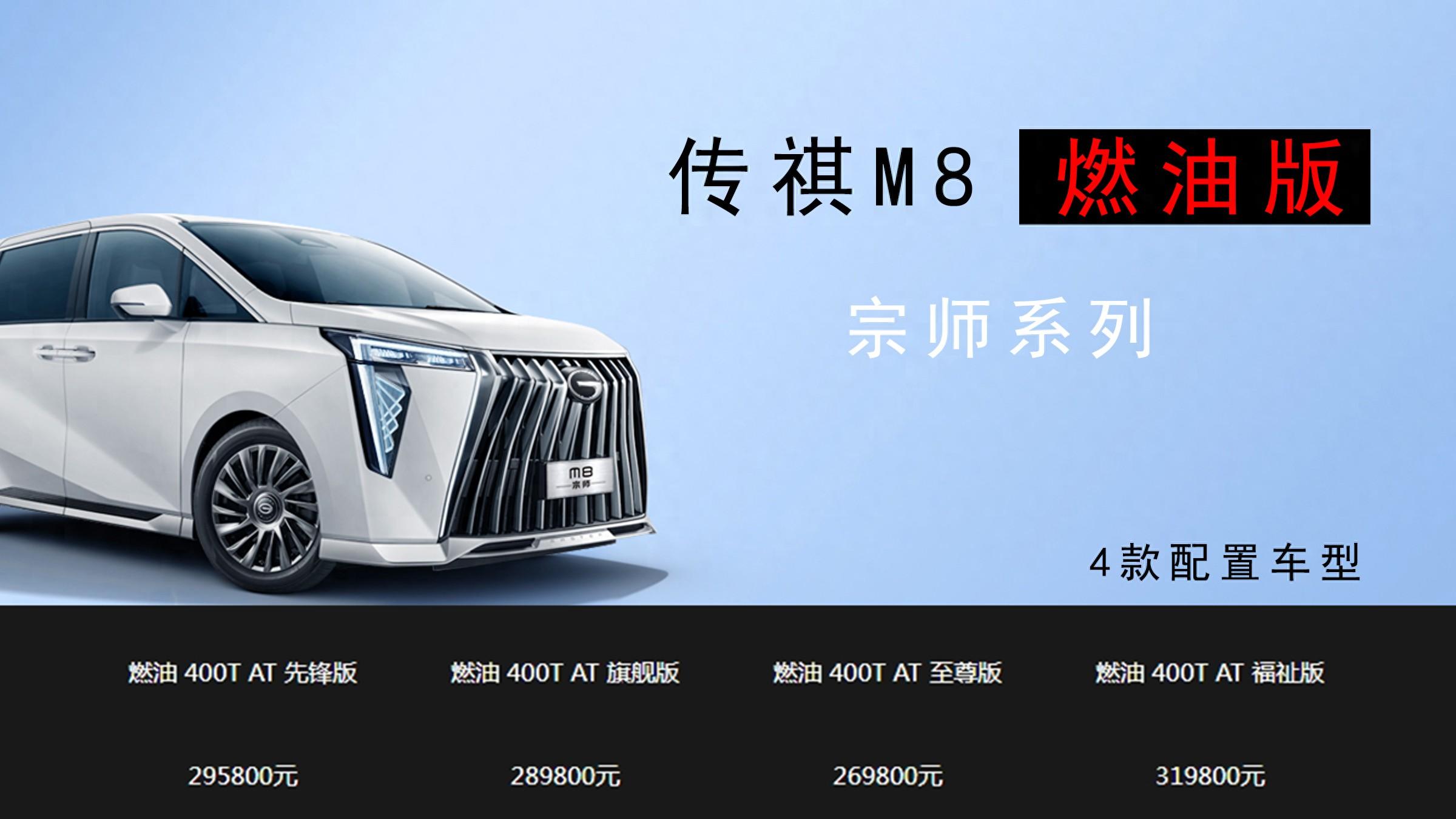 從北京車展的展臺上了解,傳祺M8 燃油版宗師系列提供了4款不同配置車型,分別為燃油 400T AT 先鋒版(2024款)、燃油 400T AT 旗艦版(2023款)、燃油 400T AT 至尊版(2023款)和燃油 400T AT 福祉版(2023款),指導價分別為29.58萬、28.98萬、26.98萬和31.98萬。接下來,我以燃油 400T AT 先鋒版(2024款)為例,給大家全方位解讀一下它的產品力。