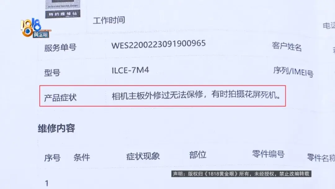 蔣女士:用了一年之后呢,又出現(xiàn)了這個卡頓,無法查看相機(jī)照片的這個情況。把機(jī)身寄過去之后呢,過了幾天那個索尼的人告訴我說,他們拆機(jī)發(fā)現(xiàn),主板有外修過的痕跡,就是非官方的一個痕跡,就是說我們?nèi)ネ庑捱^。那我就想,我是在質(zhì)保期內(nèi),我的質(zhì)保有兩年,我怎么可能去外修,而且我是第一次發(fā)現(xiàn)這個問題,就直接找索尼的官方售后了。然后他就說,我這個主板是外修過的,他們拒保,那我就想這是不是翻新機(jī)或者殘次機(jī)。