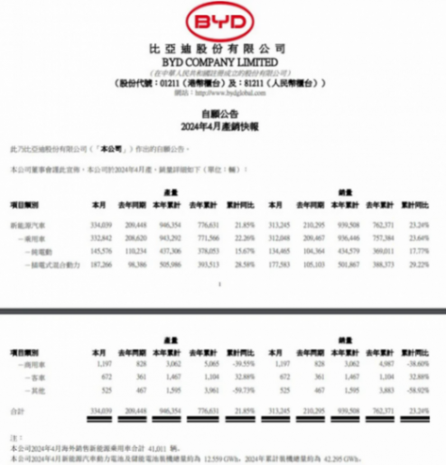 比亞迪4月汽車新能源銷量313245輛,同比增長49%,環(huán)比增長3.6%。1-4月累計汽車銷量939508輛,同比增加23%。
