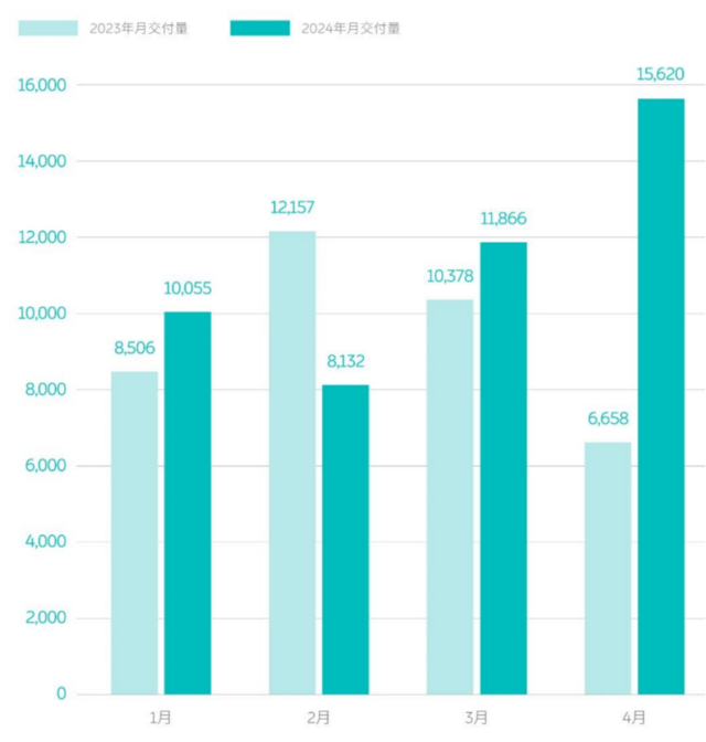 蔚來汽車4月交付15620輛新車,環(huán)比增長31.6%,同比增長134.6%。2024年迄今為止累計交付45673輛汽車,同比增長21.2%。截至目前,蔚來已累計交付新車495267臺。