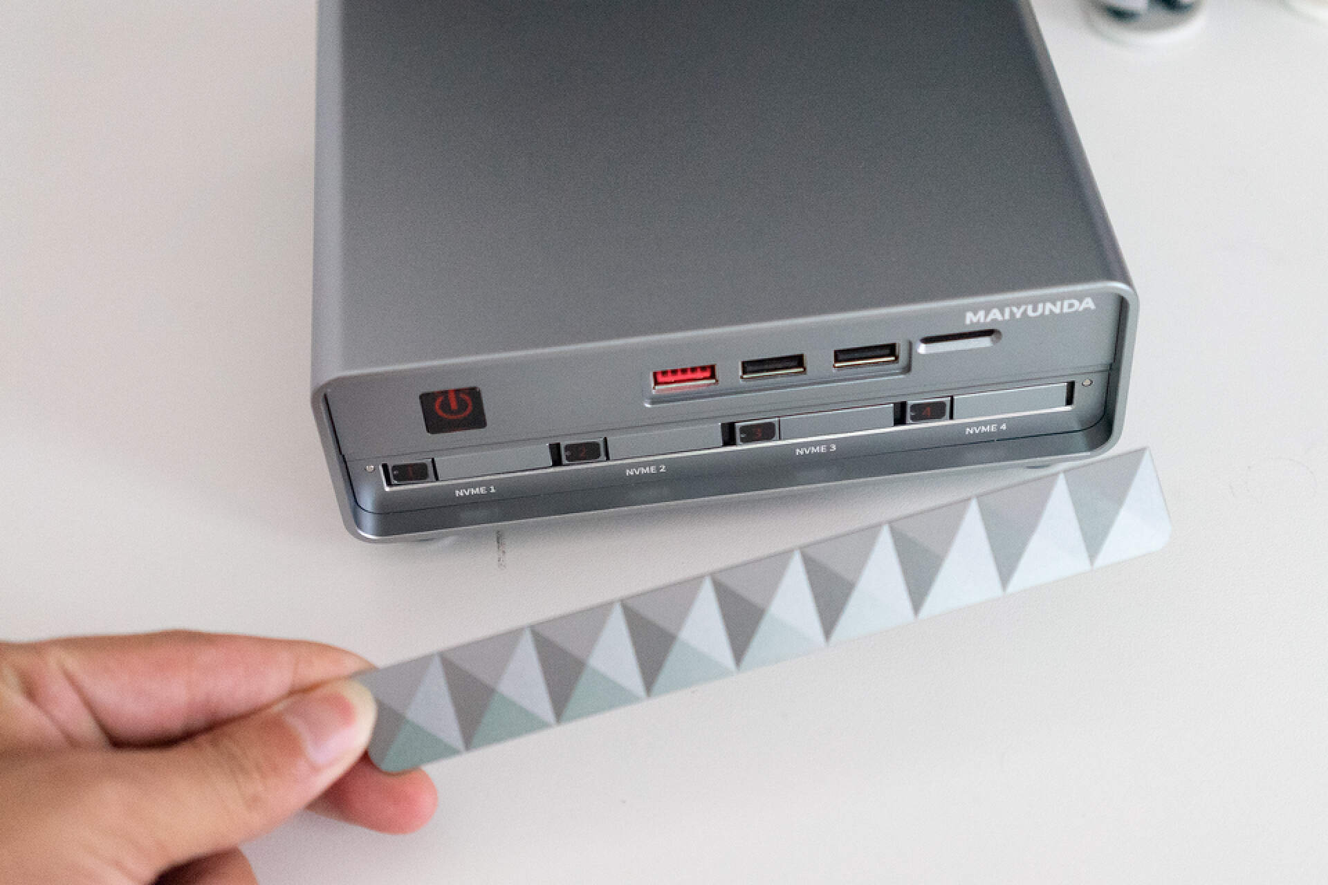 卸下磁吸擋板,可以看到4個NVME快拆硬盤倉,總共5個NVME盤位,另一個是在主板內部,我這臺是Pro版本,內存和內置的硬盤不可拆。