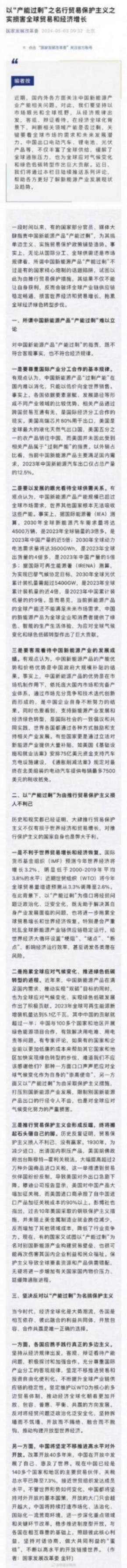 國家發展改革委3日發文稱:一段時間以來,有的國家部分官員、媒體大肆指責中國新能源產品“產能過剩”,為其搞單邊主義、實施貿易保護政策鋪墊造勢。事實上,無論從國際分工、全球供需還是市場規律看,所謂中國新能源產品“產能過剩”不過是有的國家精心炮制的話題陷阱,試圖以此為由推行貿易保護措施,其結果不僅不能讓自身獲利,反而會破壞全球產業鏈供應鏈穩定暢通,損害世界經濟和貿易增長,拖累全球經濟綠色轉型步伐。