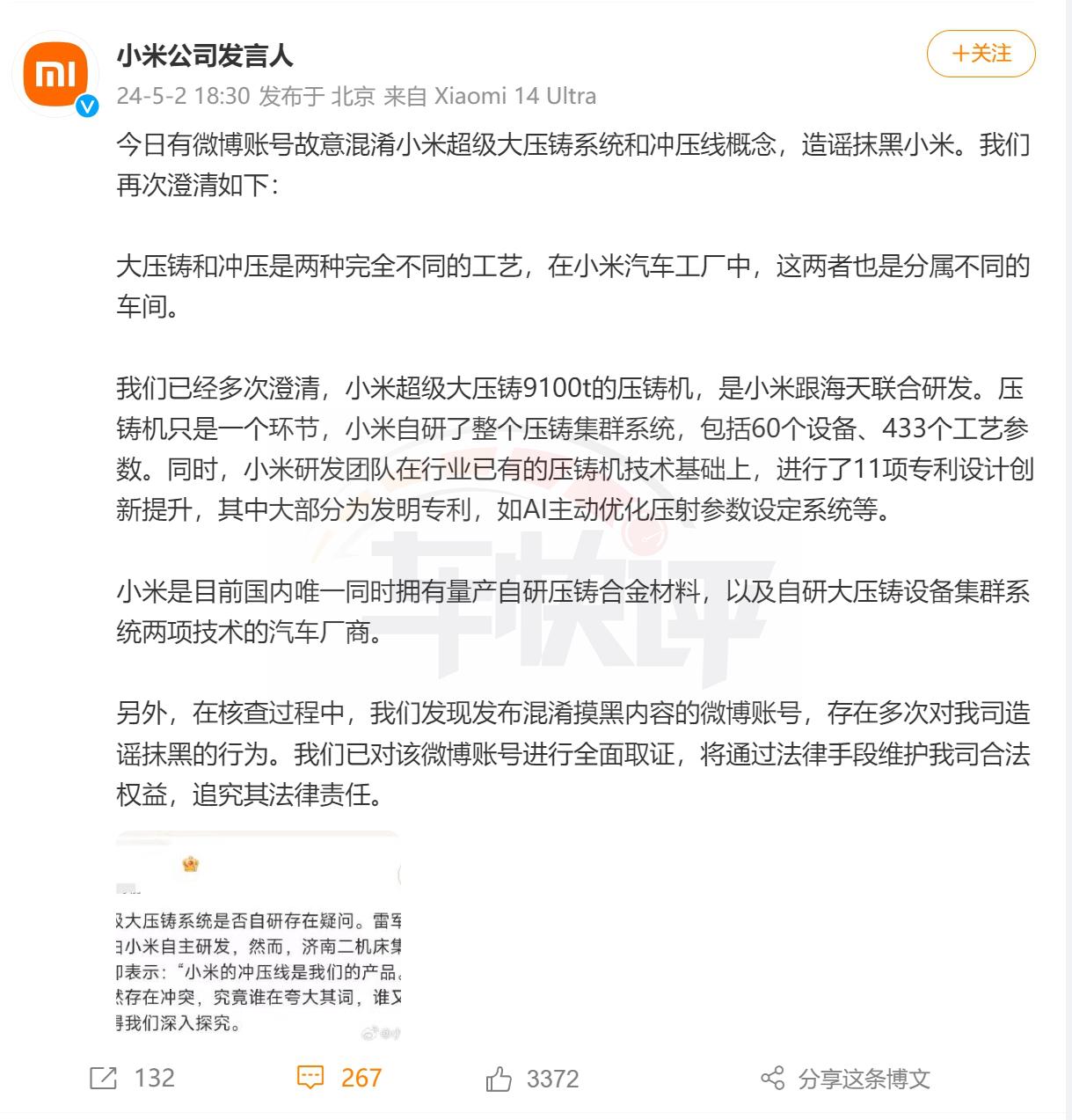 5月2日,小米公司發言人微博賬號發布消息稱,有微博故意混淆小米超級大壓鑄系統和沖壓線概念,造謠抹黑小米,存在多次造謠抹黑的行為。已經全面取證,維護自身的合法權益。