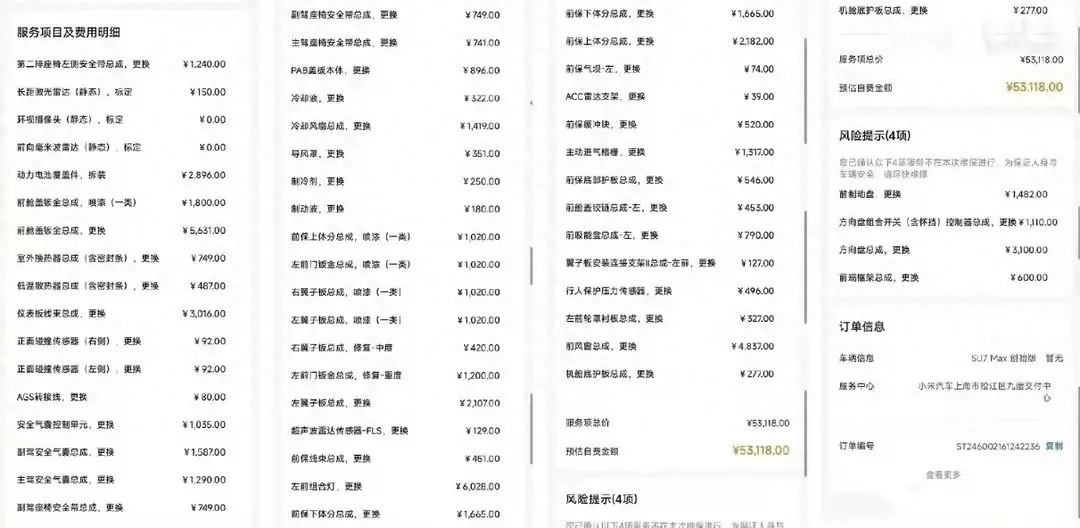知名博主堂主那臺(tái)小米SU7,修一修居然花了53000元!下圖堂主曬的維修單,有安全帶總成一千多,車門噴漆一個(gè)一千多,最貴的是左前組合燈6000多,真是不看不知道一看嚇一跳,這價(jià)格可不是一般高啊,難怪雷總說(shuō),我們100元的產(chǎn)品只賺一元,原來(lái)是等著在售后割大家的韭菜嗎?這還是咱們認(rèn)識(shí)的那個(gè)性價(jià)比之王嗎?手機(jī)1999元只是為了交朋友的原來(lái)那個(gè)小米公司嗎?對(duì)此價(jià)格,大家認(rèn)為合理嗎?